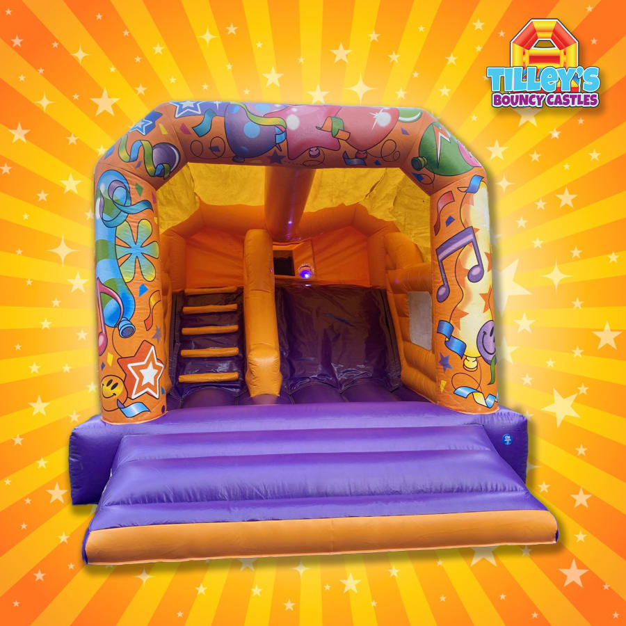 The castle itself continues the party theme, with an orange and purple interior and exterior, and a funky music and party print on the front. Children can easily access the spacious slide by 5 steps, and can then whizz down onto soft bouncy landing beds. Children can then bounce the day (or night!) away under the disco lights to your favourite tunes! The slide, Bluetooth speaker and disco lights are all covered by a shower cover for protection from the English weather should you choose to celebrate outside.